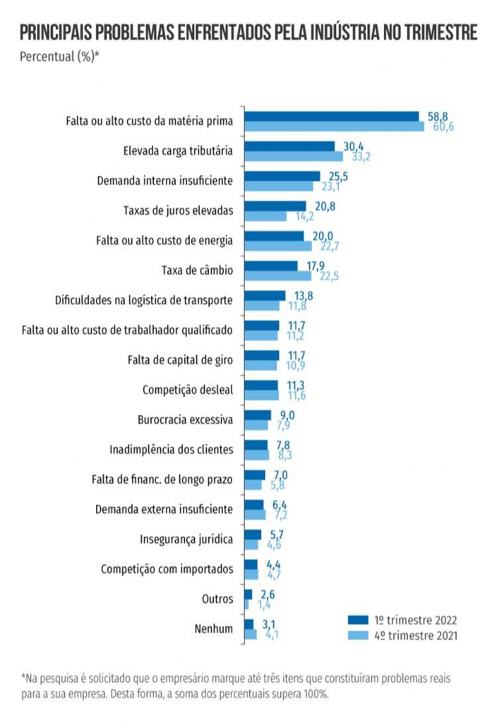 A Sondagem Industrial do primeiro trimestre, da Confederação Nacional da Indústria (CNI), mostra que 58,8% dos empresários ainda consideram a falta ou o alto custo da matéria-prima o principal problema enfrentado pela indústria. No entanto, esse percentual caiu em relação ao período anterior e outros três problemas começaram a despontar: demanda interna insuficiente, taxas de juros elevada e dificuldades com logística. A pesquisa ouviu 1.842 empresas entre 1º e 11 de abril.